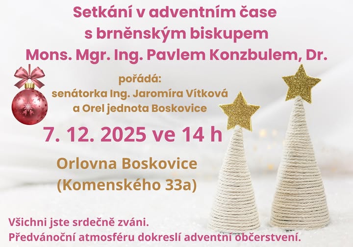 - Otec biskup bude v neděli v 9:30 slavit mši sv. v kostele v Boskovicích. Odpoledne je možné s ním pobesedovat v Orlovně v Boskovicích.