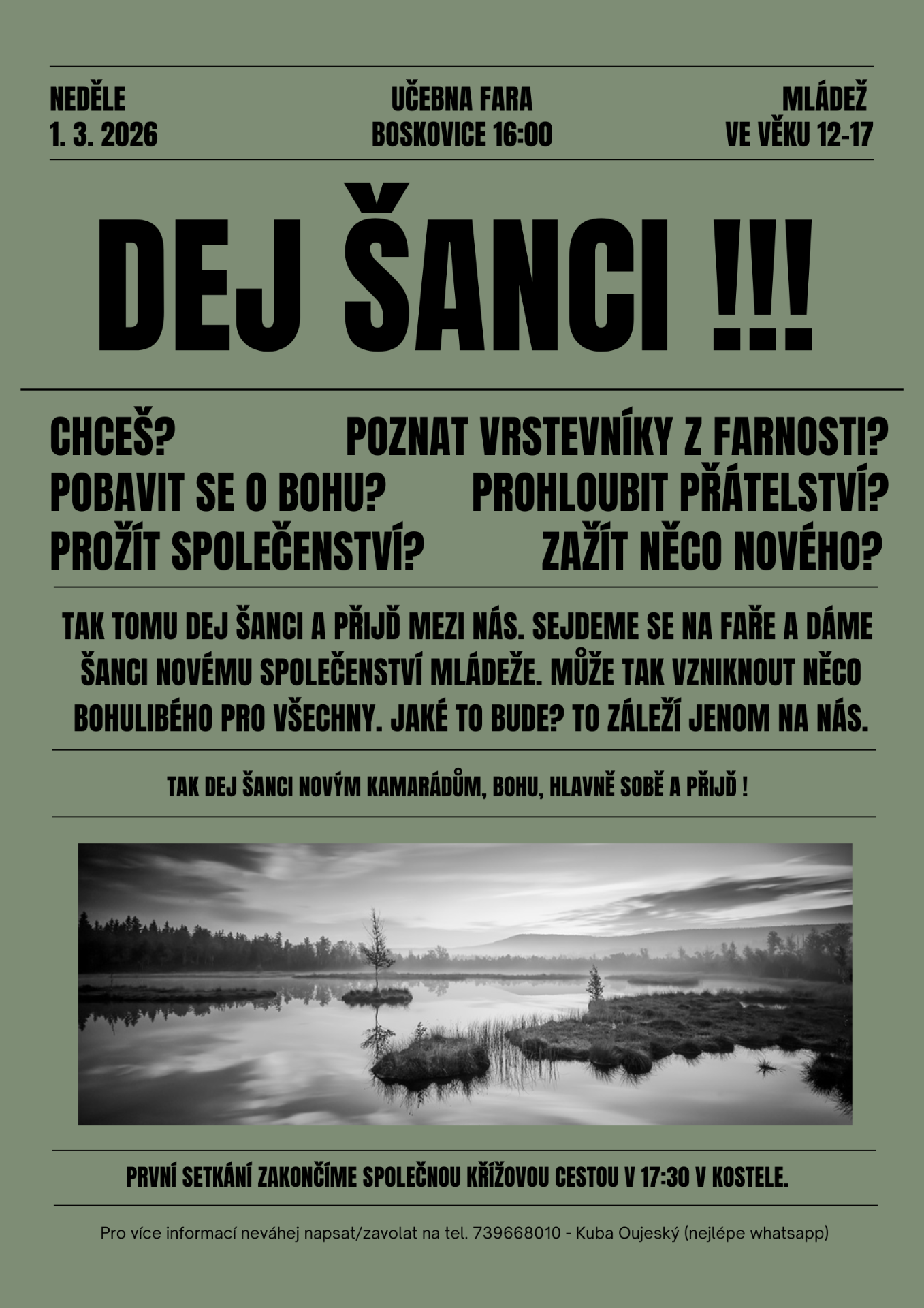 Ahoj. Již nějakou dobu se v naší farnosti neschází spolčo mládežníků ve věku 12 - 17 let. A jelikož je po takovém setkávání poptávka, rozhodli jsme se to změnit. Jak často a kdy přesně se budeme setkávat, můžeš ovlivnit i ty! Stačí, když dorazíš na první setkání v neděli 1.3.2026 na faru do učebny. Toto naše první setkání zakončíme křížovou cestou v kostele.